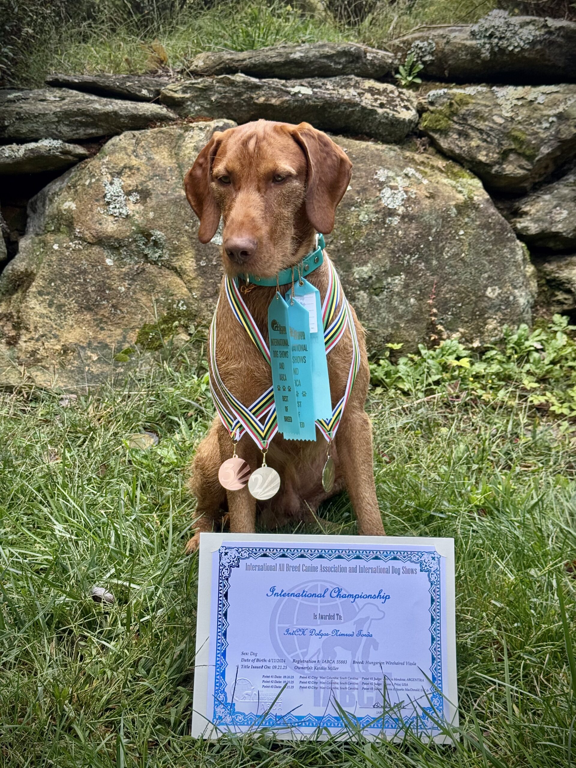 Aszú joined our family in July 2024, along with Rokka. From the moment I laid eyes on him, I knew he was something special. While I typically wait a season before entering young pups in hunt tests, Aszú’s natural drive and retrieve were so exceptional that I decided to enter him early. He exceeded my expectations, earning his Junior Hunter title and NAVHDA Prize II at just six months old!